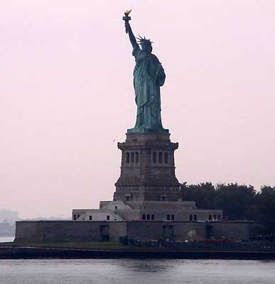 ![]() 雨模様の中の、自由の女神像。 |