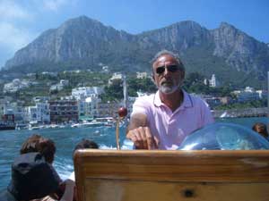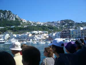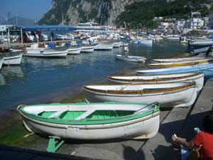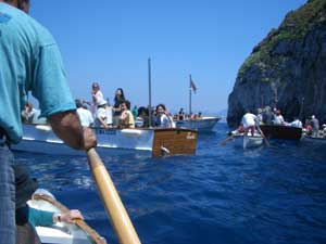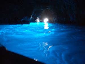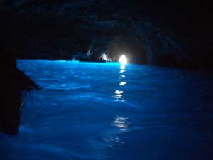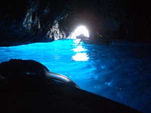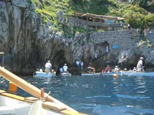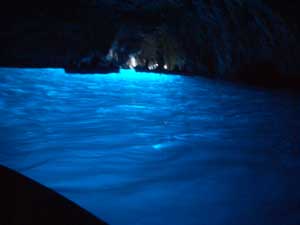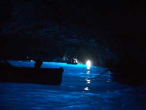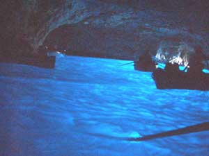 | 青の洞窟内に、何艘ものボートが浮かぶ 洞内は、船頭が歌うカンツォーネがひびきわたっていた |