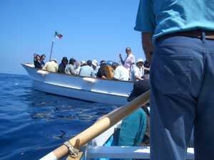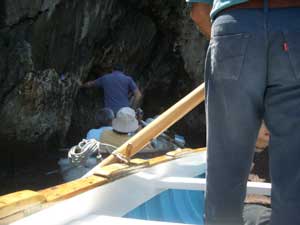 | モーターボートで青の洞窟の入り口に向かう | 洞窟の中には手漕ぎボートではいる |