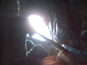 | 高さ1m、幅1mほどの入り口の中へ、鎖を利用して入っていく | 青の洞窟に入った直後に振り返って撮影 |