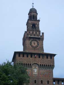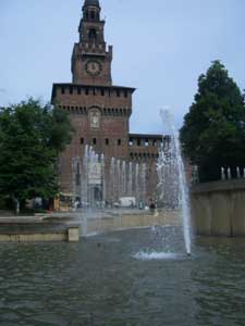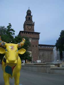 | 牛の彫像とスフォルツァ城 このような牛の彫像があちこちにあった |