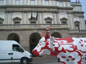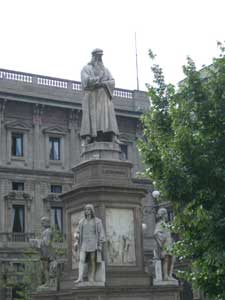 | スカラ座広場にあった牛の彫像とスカラ座 | スカラ座広場にあるレオナルド・ダビンチの像 |