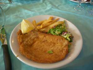 ミラノの名物料理 ミラネーゼ 仔牛のムネ肉を叩いて薄くのばし、 オリーブオイルでカラッと揚げたもの |
