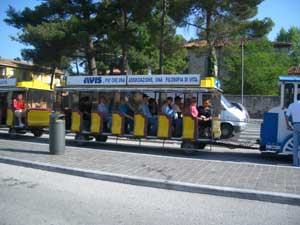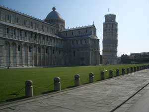 | バス駐車場から斜塔へ向かう連絡バス | ピサの斜塔 斜塔はやはり傾いていた |
