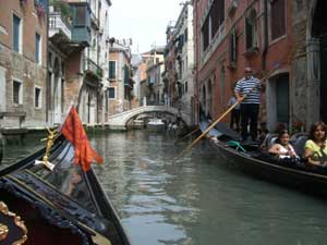 運河上のゴンドラ 狭い運河を船頭がうまくすり抜けていく |